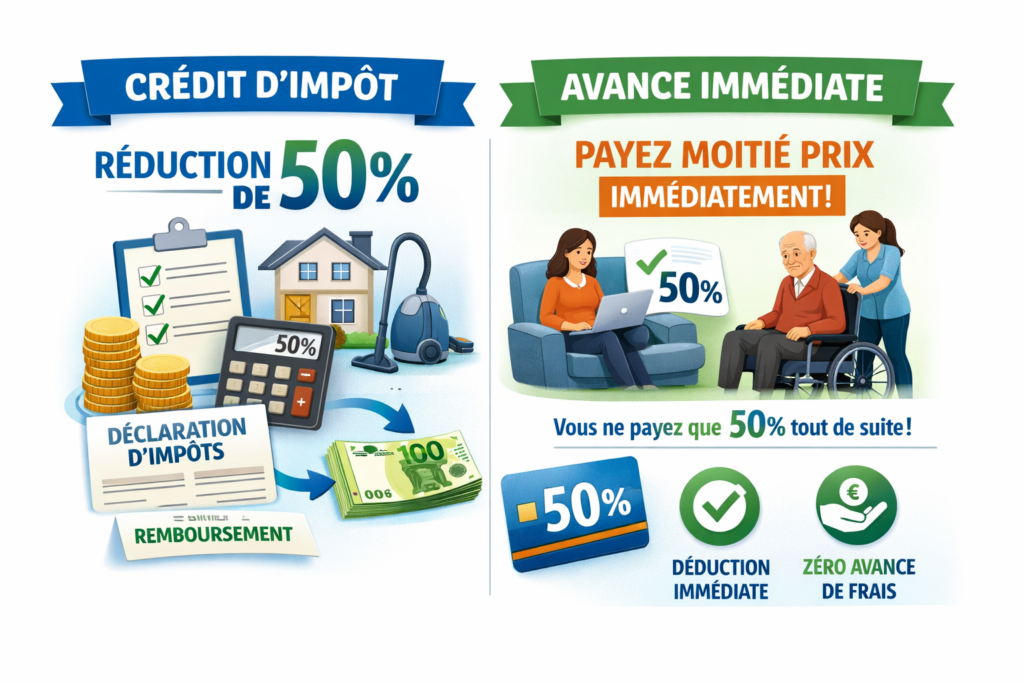 Bénéficiez de la réduction de 50% directement sur votre facture. L'URSSAF vous verse l'avance immédiatement.
