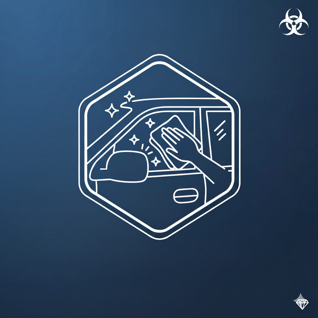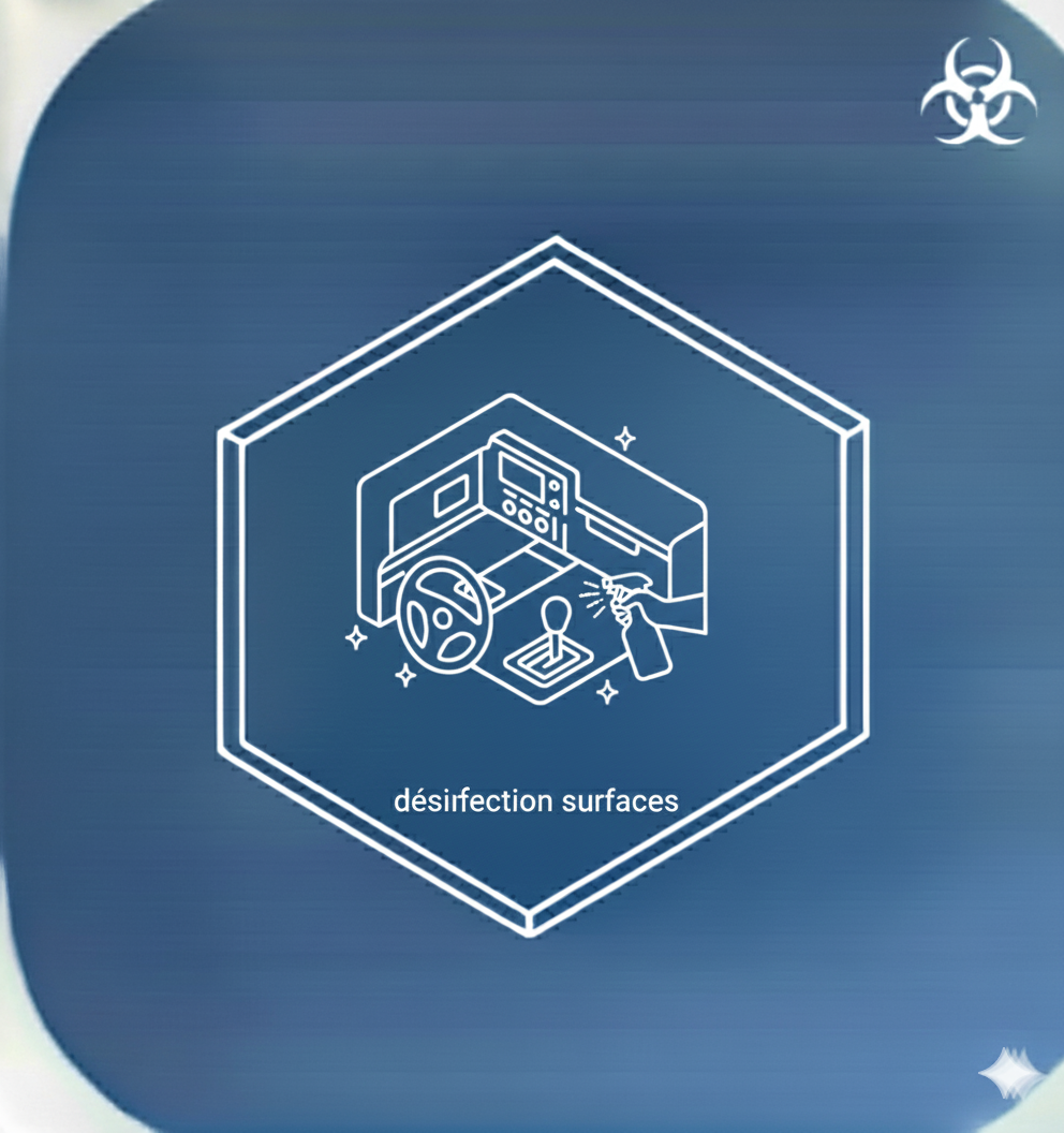 Désinfection du tableau de bord, des plastiques et des surfaces de contact (volant, poignées, levier de vitesse).